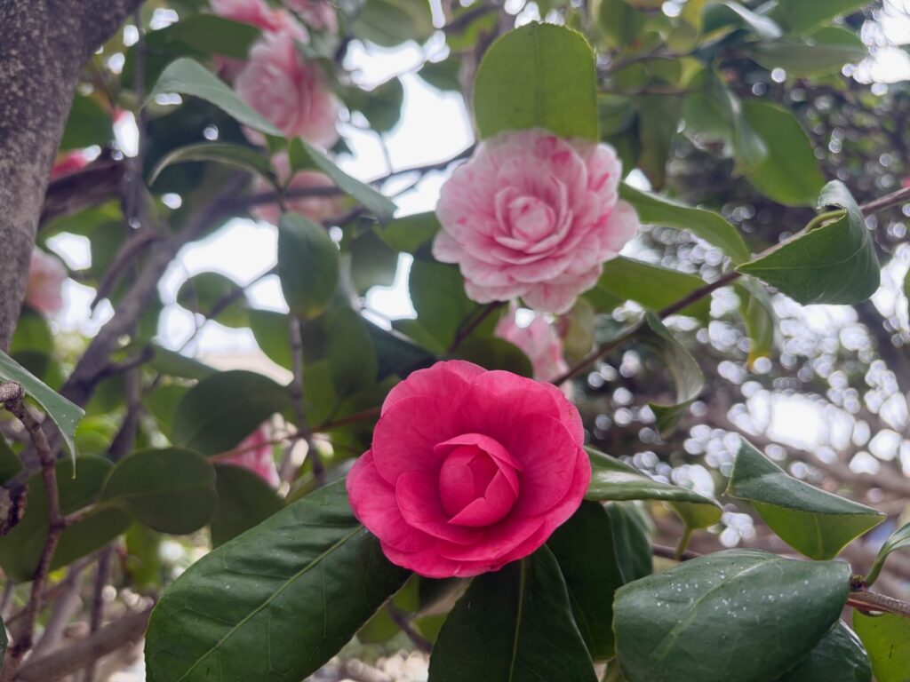 弊社敷地内の庭では、色とりどりの椿の花が鮮やかに咲いております。